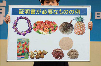 นั้นอยู่ในรายชื่อผลไม้ที่ห้ามนำเข้าเด็ดขาด อาจมีแมลงศัตรูพืชหรือเชื้อโรคในพืช ที่สามารถแพร่กระบาดภายในญี่ปุ่นได้ หากมีการนำเข้าจะเป็นการกระทำที่ผิดกฎหมายการนำเข้าโดยไม่มีใบรับรองนั้นถือเป็นการกระทำความผิด🥭 สิ่งของที่ต้องมีใบรับรองจึงนำเข้าได้