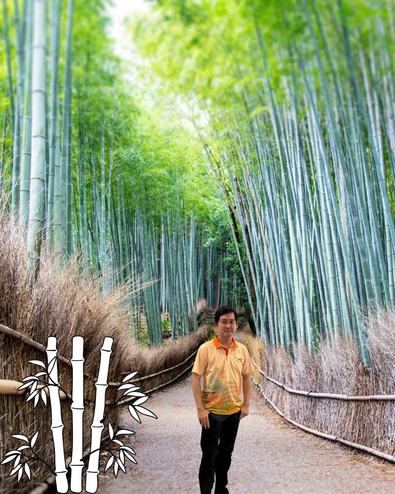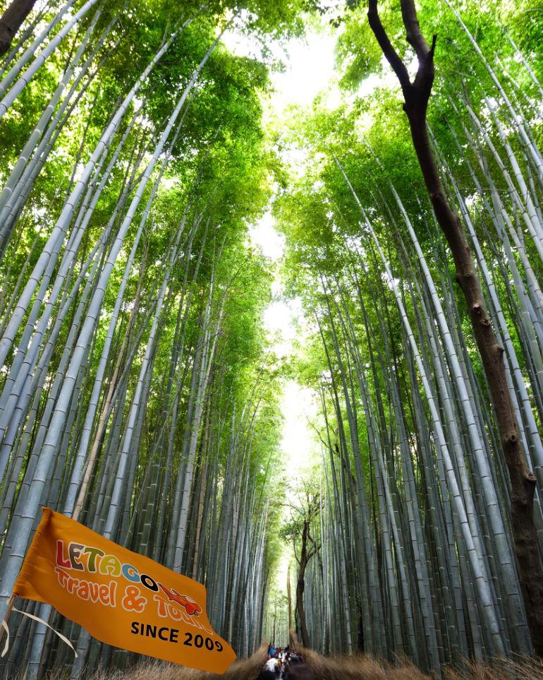 เส้นทางป่าไผ่แห่งนี้ทอดยาวประมาณ 500 เมตร ระหว่างสถานีรถไฟ Arashiyama และวัดเทนริวจิ (Tenryu-ji Temple) ตลอดสองข้างทางเต็มไปด้วยต้นไผ่สูงเรียงแน่นราวกับอุโมงค์เขียวที่พัดไหวไปตามลม เสียงไผ่เสียดสีกันเบา ๆ กับแสงที่ลอดผ่านยอดไม้ให้บรรยากาศที่สงบและผ่อนคลาย